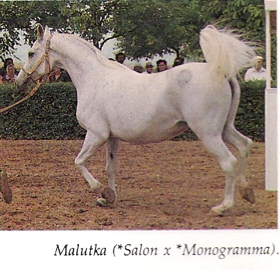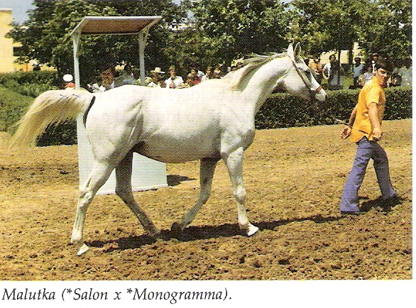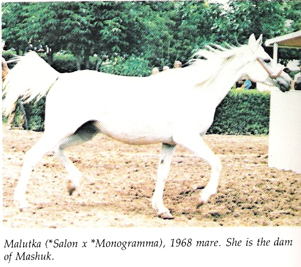 "Next in line was Malutka (*Salon x *Monogramma), a typey grey foaled in 1968. She was coveted by successive waves of visitors through the years, but was not for sale. In 1978 Malutka was Champion of the Moscow All-Union Exhibition, which is open to all breeds, and her full sister, as well as their dam, won the Certificate of First Degree. Malutka's son Mashuk, by Aswan, is now a sire at Tersk. His full sister, Malinka, produced the airy-going Mukomol (by Kumir), who enraptured those who saw him at the race track as a two-year-old in 1981. He too is now at Tersk. Six of Malutka's foals have been by Aswan, one by Elfur and one by Namek. She was bred to *Pesniar for a 1982 foal."
